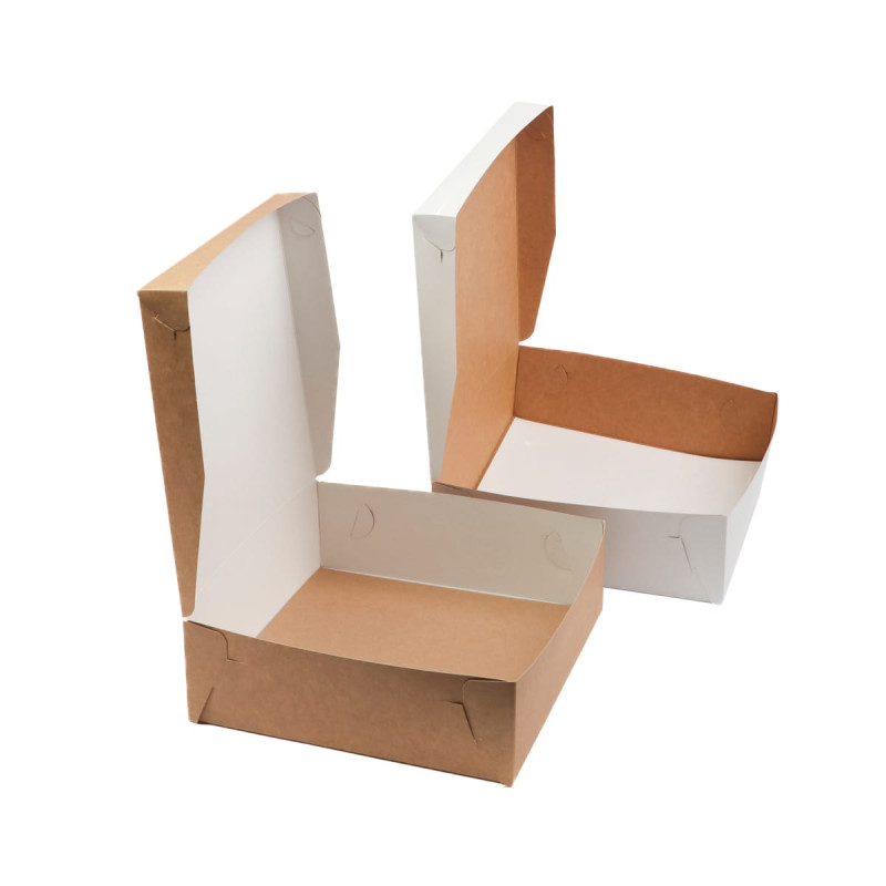Kartona iepakojums ar atveramu vāku, piemērots konditorejas izstrādājumu iepakošanai. Materiāls, no kura izgatavots iepakojums, atbilst augstākajiem pārtikas iepakojuma materiālu standartiem – ekoloģiski tīrs, neietekmē produktu smaržu un garšu.