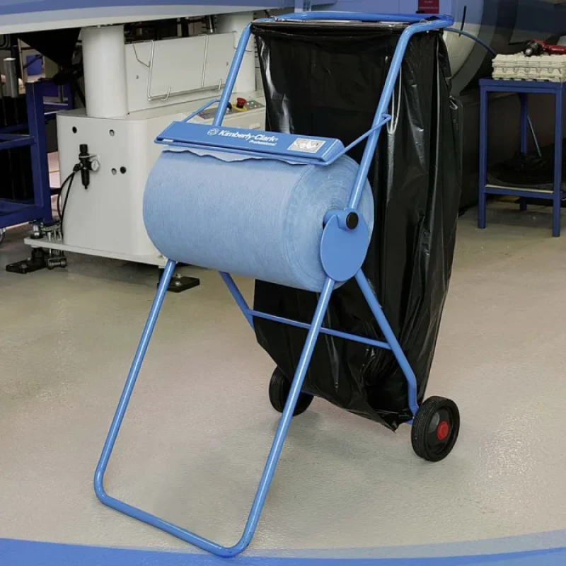 Kimberly-Clark Professional mobilais industriālo papīru turētājs ir daudzpusīgs — to var izmantot gan kā sienas stiprināmu dozatoru, gan kā mobilo, brīvi stāvošu risinājumu. Dozators ir aprīkots ar pievienotu atkritumu maisa turētāju, kas nodrošina ērtu atkritumu savākšanu. Piemērots lietošanai ar dažādiem lielajiem papīra dvieļiem.